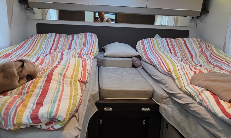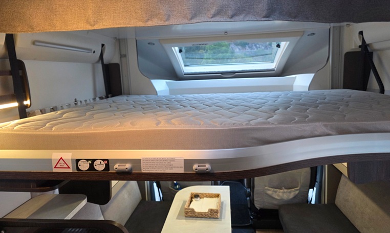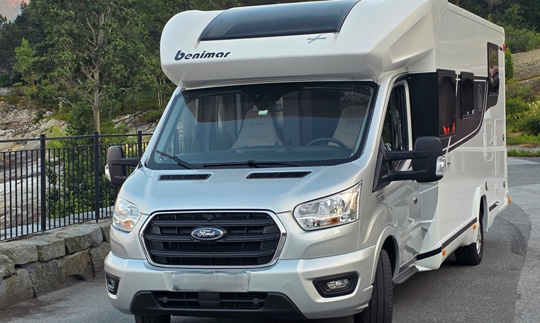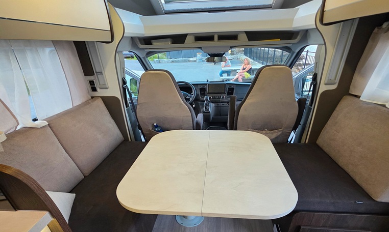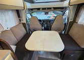 The motorhome is registered for 4 people, and the face-to-face lounge feels very spacious, with 2 swiveling pilot chairs in the front. There is also an electric drop-down bed above the lounge. Passenger seats are hidden in the lounge when not in use. 2 ISOFIX points in the rear passenger seats. The motorhome is well-equipped from the factory, including: 170 hp Ford engine.