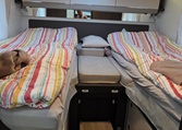 VAT incl.The Benimar Tessoro 468 features a combination of two single beds at the rear and a drop-down bed above the face-to-face lounge solution. A highly attractive layout. The rear beds can easily be converted into a large double bed by pulling out a panel in the middle. There is also a step for accessing the bed when the panel is not extended. The step can be opened from the inside for easy access to the garage.