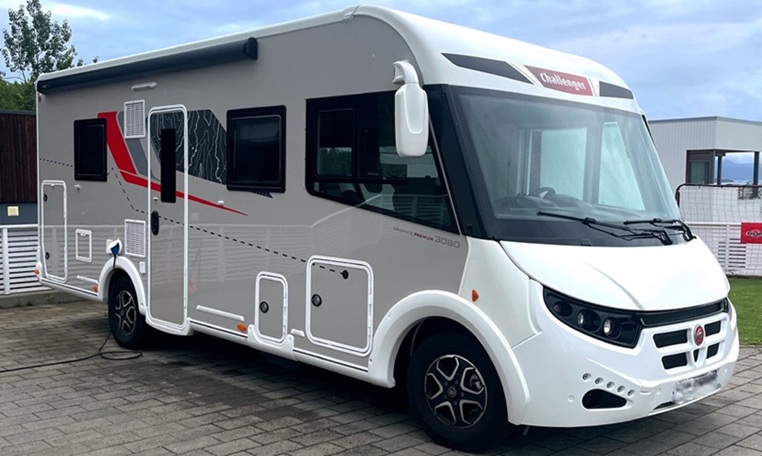 VAT incl.Challenger 3080 Graphite Premium / 5-Seater / Drop-Down Bunk Bed + Drop-Down Bed / Truma Diesel + 230V2022 model from Challenger, a Graphite 3080 Premium with a fantastic layout featuring a large drop-down bed (190 cm x 160 cm) above the seating area and a drop-down bunk bed in the rear.