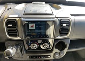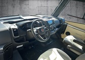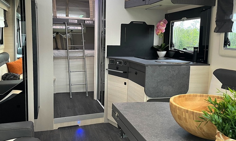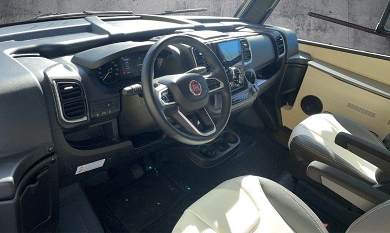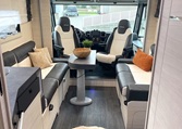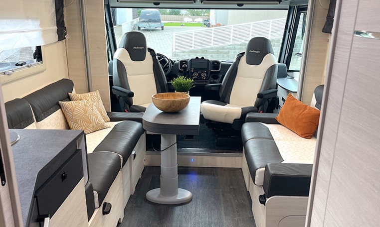The motorhome has a highly spacious SmartLounge seating area with a movable and foldable table that can be electrically lowered and raised. The SmartLounge seating area consists of two large sofas facing each other, and the sofa benches can easily be converted into individual standalone seats with three-point seat belts for travel. Both rear-facing seats have ISOFIX, while the fifth seat (facing opposite the direction of travel) has a two-point seat belt and no ISOFIX.