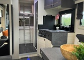 The kitchen features a large countertop with a two-burner stovetop with integrated ignition. The sink is deep, and the kitchen counter includes an additional foldable flap that can be easily raised when needed. The refrigerator has a 134-liter capacity with an integrated freezer and AES function (Automatic Energy Selection), meaning the refrigerator automatically selects the most suitable energy source; all you need to do is turn it on.