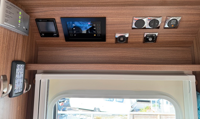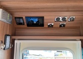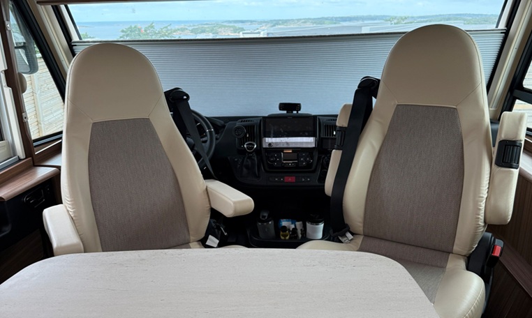 Face-to-face seating group. 2 fold-down seats with Isofix. Extra-large front drop-down bed. Studded tires on alloy wheels. SKANBAT 2000 W inverter. 32” smart TV. Hydraulic support legs. 2 x 100 W solar panels. 2 SKANBAT lithium batteries.