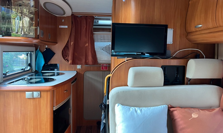 Its compact yet spacious interior features a roomy fixed double bed, a sociable lounge area with a half-dinette seating up to five, and a practical kitchen with an oven/grill and fridge/freezer. The washroom combines a circular shower and toilet for efficient space use, complemented by stylish light fittings and a cab sunroof for an upscale feel.