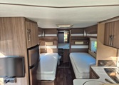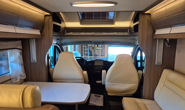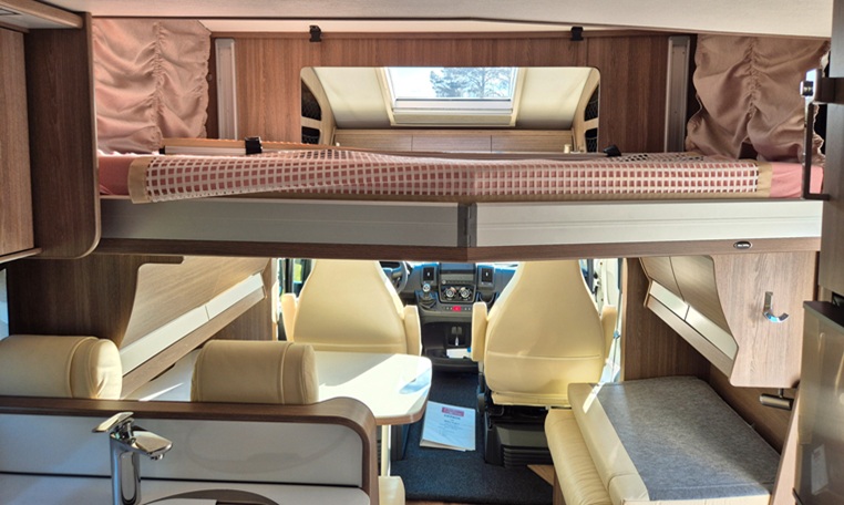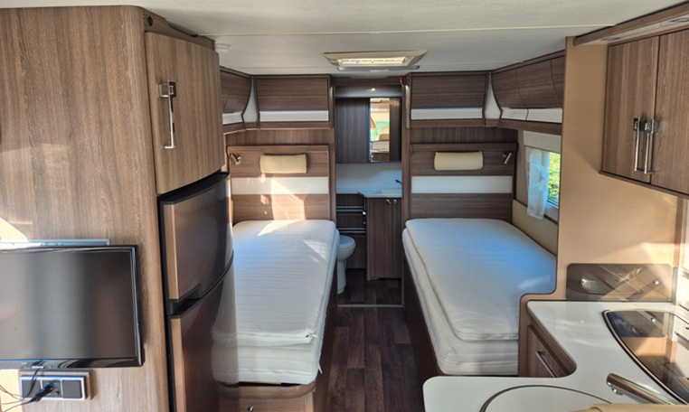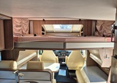 Beautiful lighting with dimming options throughout the living area. Two single beds with an electric drop-down bed in the front.