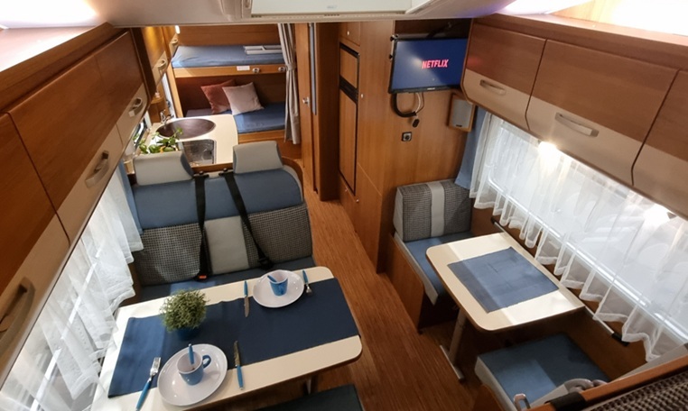 The vehicle can be driven with a Category B driver’s license! Spacious alcove motorhome for the family, with a double bed over the driver’s cab and two bunk beds in the rear. The lower bunk can easily be folded up if you need extra height in the storage compartment, plus the seating area can be converted into a sleeping space.